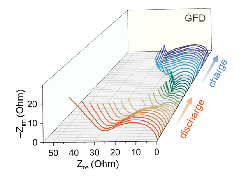 作者對兩類電池進(jìn)行了原位電化學(xué)阻抗譜測試,研究發(fā)現(xiàn)采用GFD隔膜的電池阻抗放電時減小,充電時增大,而采用PVA隔膜的則全稱保持穩(wěn)定。這與其背后的反應(yīng)機(jī)理有關(guān):PVA隔膜可以使整個反應(yīng)過程更穩(wěn)定,不存在因?yàn)橐合嗳芙鈱?dǎo)致的阻抗變小。
