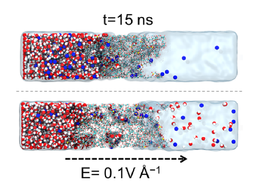 作者通過通過分子動力學(xué)計(jì)算證明,在飽和NaOTf的電解質(zhì)中,Na?離子可以輕松穿透膜,進(jìn)一步與硫物種反應(yīng),而沒有檢測到遷移的水。相比之下,在原始電解質(zhì)中,水分子會向陰極側(cè)遷移。該研究證實(shí)了電荷載流子的貧水配位結(jié)構(gòu)可以抑制電池系統(tǒng)中的水遷移。