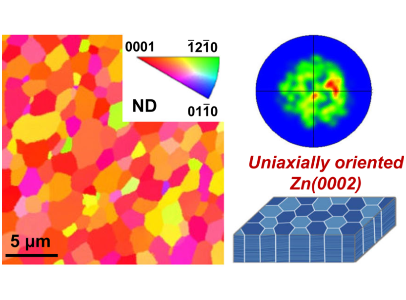 作者對兩類不同鋅負(fù)極進(jìn)行了晶體學(xué)取向測試,發(fā)現(xiàn)Com-Zn顆粒尺寸與晶體取向分布均不均勻。作為對比,另一中Zn不僅尺寸均勻而且整體取向一致。這種[0001]取向結(jié)構(gòu)有利于避免枝晶形成同時保持結(jié)構(gòu)穩(wěn)定